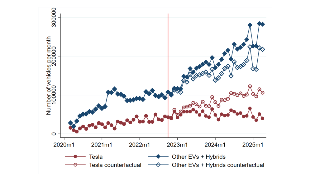 Bonne question, mais les auteurs ont publié leur papier, donc on peut regarder. En gros, ils ont créé un modèle économétrique et l'ont appliqué aux résultats électoraux dans les comtés des USA. Ce modèle leur a permis de quantifier le différentiel de ventes en fonctions couleurs politiques par comté, et à partir de là les variations de ventes attribuables au facteur "opinion politique". L'hypothèse est que si les électeurs Démocrates se mettent à moins acheter alors que les Républicains achètent (au moins relativement) plus, il s'agit d'une influence de la politique sur les ventes. Par ailleurs les sondages (qu'ils citent) sur les opinions sur EM en fonction du bord politique avant / après 2022 sont très clairs, mais c'est pas là dessus qu'est basé le calcul. C'est seulement ce qui permet le raccourci "effet politique = effet EM". Les figures à la fin illustrent les résultats, et ci-dessous on a les deux courbes avec et sans effet politique. La courbe sans effet politique (counterfactual) correspond à un mix Démocrates / Républicains dans les ventes qui n'aurait pas changé.