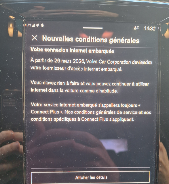 2. Volvo Car devient le fournisseur internet dans nos véhicules à partir du 26 mars 2026 Bonne ou mauvaise nouvelle ? D'ailleurs quelqu'un a-t-il atteint le délai au delà duquel c'était censé devenir payant ? Pour info