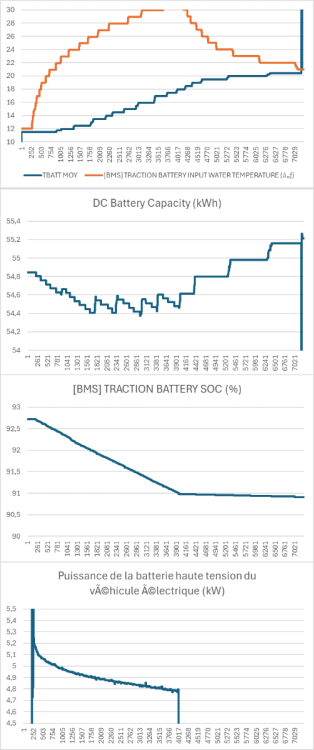 Salut à tous, petit test ce midi Je voulais voir si on pouvait lancer le préconditionnement de la batterie à l'arrêt, en indiquant une station de recharge proche (1km) comme destination dans le GPS Alors, effectivement ça marche, mais en plus j'ai pu constater le regain de capacité avec l'augmentation de la température de la batterie : - je mesure une consommation des CTP de 4.9 kW en moyenne sur 14'30" pour passer de 10°C à 20°C, ce qui nous donne une consommation d'énergie de 1.2 kWh environ - tout en consommant 1.2 kWh, la quantité d'énergie dans la batterie... augmente avec l'effet température, capacité de départ 54.8 kWh, capacité à la fin : 55.1 kWh (je précise que je suis pas branché évidemment) 😅 -