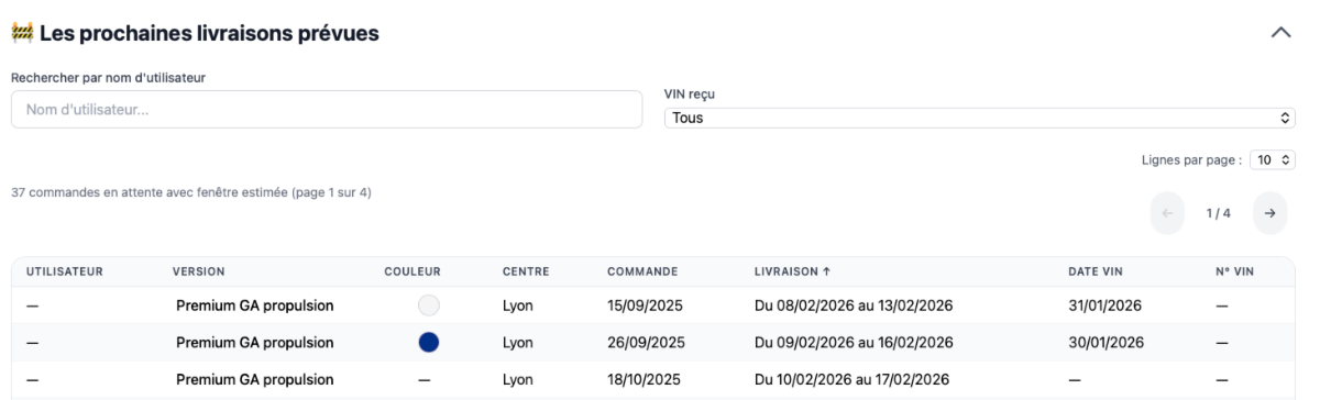 Dans les "prochaines livraisons prévues", tu vas avoir plein de personnes qui ne vont pas mettre à jour leur date de livraison prévue (*), qui ne vont pas revenir mettre leur livraison, etc... Donc si j'étais toi, tout ce qui est "antérieur à aujourd'hui", je ne l'afficherai pas, j'afficherai que la semaine en cours et supérieur. Sinon tu vas vite être pollué par tous les anciens qui n'ont pas mis à jour, et il faut scroller à la page 4 pour trouver ceux qui vont être livrés dans la semaine sur telle ou telle ville. My 2 cents De même, quand on veut changer sa date de livraison, je n'aime pas trop le fait de devoir remplir Livraison avec 2 dates, et ensuite devoir mettre uniquement la première date à jour et effacer la 2ème date --> 1/ car c'est pas intuitif. 2/ car il n'y a pas de bouton "effacer" et j'ai du effacer tous les chiffres My 2 cents...