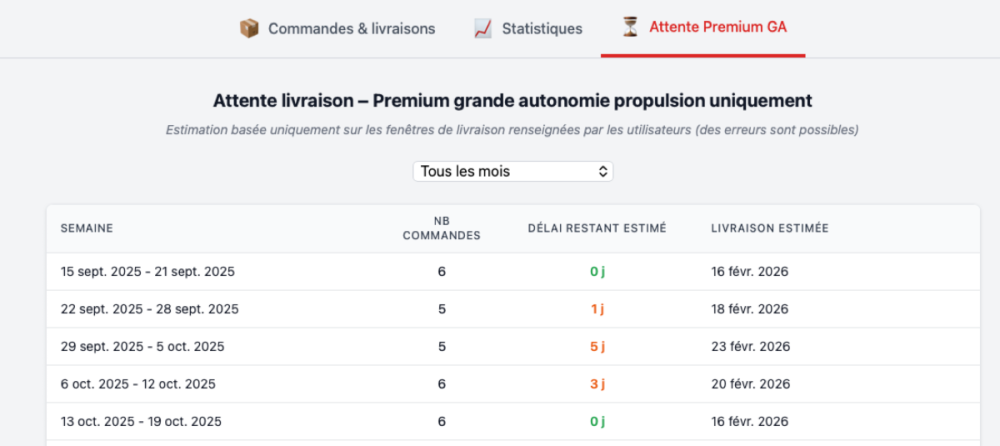 Alors semaine = semaine de commande et délai restant estimé c'est le nombre de jours qu'il reste jusqu'à la livraison estimée (toujours suivant les infos fournis par les membres). Je trouvais ça sympa pour quantifier l'attente. Je vais rajouter un petit texte explicatif au dessus et modifier les oms des colonnes pour que ça soit plus compréhensible tu as raison ! Ok, je vais prendre ça en compte et en plus je pense que ça peut "forcer" les gens à mettre à jour leurs dates si jamais ils ne se voient plus dans le tableau. Dans la même logique, est-ce que tu penses que toutes les commandes avec une fenetre de livraison passé ET qui n'ont pas de date de livraison renseignée je les exclues des compteurs des "Commandes actuellement en attente de livraison" ? Que me proposes tu ? 😄 une seule date ?
