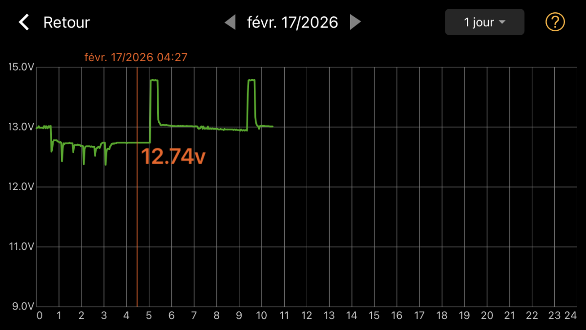 Avec un Battery Monitor on peut suivre les évolutions de la tension de la batterie 12V, enregistrées par le BM2, ou équivalent. On découvre que la batterie auxiliaire est maintenue à 13V tout au long de la charge HT. La fin de cette charge est repérable à la chute de tension de la 12V. Celle-ci est suivie de variations qui indiquent un travail, attribué à l'équilibrage : Charge HT à 100%, fin de charge 00h40. Fin de l'activité 12V liée à l'équilibrage HT 03h20. Temps d'équilibrage 02h40. Quand on m'a remplacé la batterie HT, je ne pouvais charger qu'à 98%. En laissant la voiture en charge sur une longue période, le problème a été résolu.