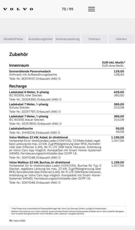 Concernant le V2G... Volvo a fait un Ask Us Anything sur Youtube: Dans la vidéo ils disent que le V2H sera disponible uniquement en Suède dans un premier temps, avec la Wallbox Volvo. Sur la liste des prix allemands ils mentionnent que les bornes sont prêtes ("vorbereitet") pour le V2H/V2G: