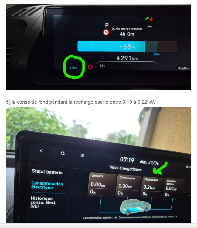 J'ai aussi une petite installation solaire , dont je me sers pour recharger ma batterie VE . Avec Hyundai ,la voiture accepte à partir de 6 A ,mais les pertes sont considérables à ce niveau Mais volontairement , je charge seulement ,si la puissance produite est égale à 2000 W env. Avec le bruit de fond permanent de la maison ,et en chargeant à 8A ( 1800 W) ,j'accepte de prendre un peu sur le secteur . Et c'est là ou je rejoins les avis ci dessus , ne pas oublier que la voiture consomme en permanence ,mon relevé : Donc ,si la puissance de charge est très faible , on fait tourner l'électronique ,pendant des heures pour presque rien. Hors solaire , ma charge se fait , en 16 A ,pour minimiser le temps de fonctionnement . Avec batterie 49 kWh ,pour 50 % de batterie : en 8A , conso 31 kWh ,temps 16.67 h en 16 A , conso 28 kWh ,temps 7.66 h en 6A , d'après 1 essai , pratiquement 21 h ,pour 50 % batterie .......... C'est ce qui correspond à une charge solaire au mini . Enfin ,c'est ma façon de faire ,le solaire pour la maison d'abord ( pas de souci en tout élec ,chauffage + clim ) Et à partir d'une certaine puissance le VE en profite ....