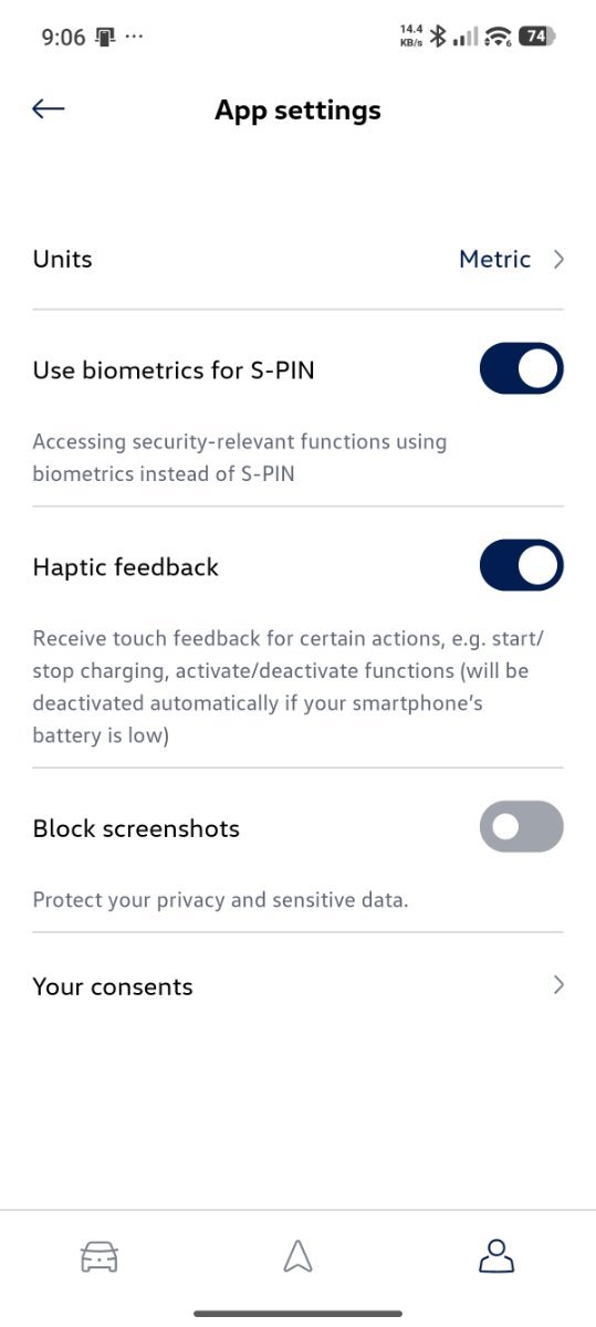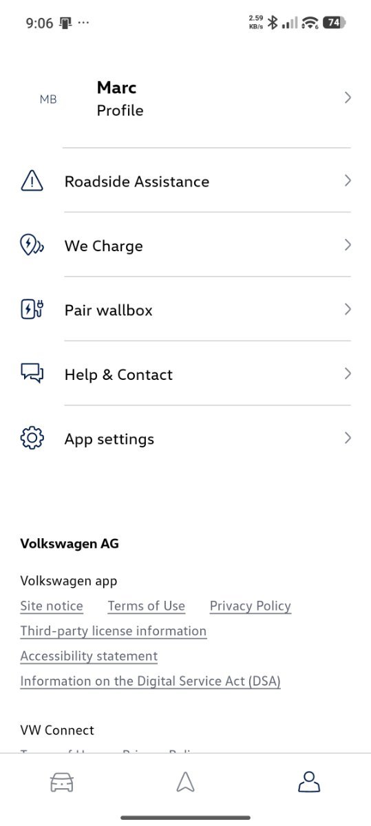 We Charge Go : 5,99€/mois sans engagement qui permet d'obtenir 39 centimes du kWh sur Ionity. We Charge a l'avantage de permettre l'utilisation du Plug and Charge chez Ionity. Pour le coup la surcouche Cupra de l'application a une ergonomie différente : Au passage pour ceux qui souhaitent pouvoir prendre des captures d'écran sur l'application VW. Aller dans Profil, puis réglages de l'application : Puis désactiver l'option qui bloque les captures d'écran : Le planificateur d'itinéraire VW via l'application VW fonctionne très bien. L'itinéraire dans la voiture étant exactement celui que l'on obtient via l'application. Cela fonctionne si bien que je n'ai plus lancé ABRP depuis des mois alors que je dispose de la version Premium.- 2 063 réponses