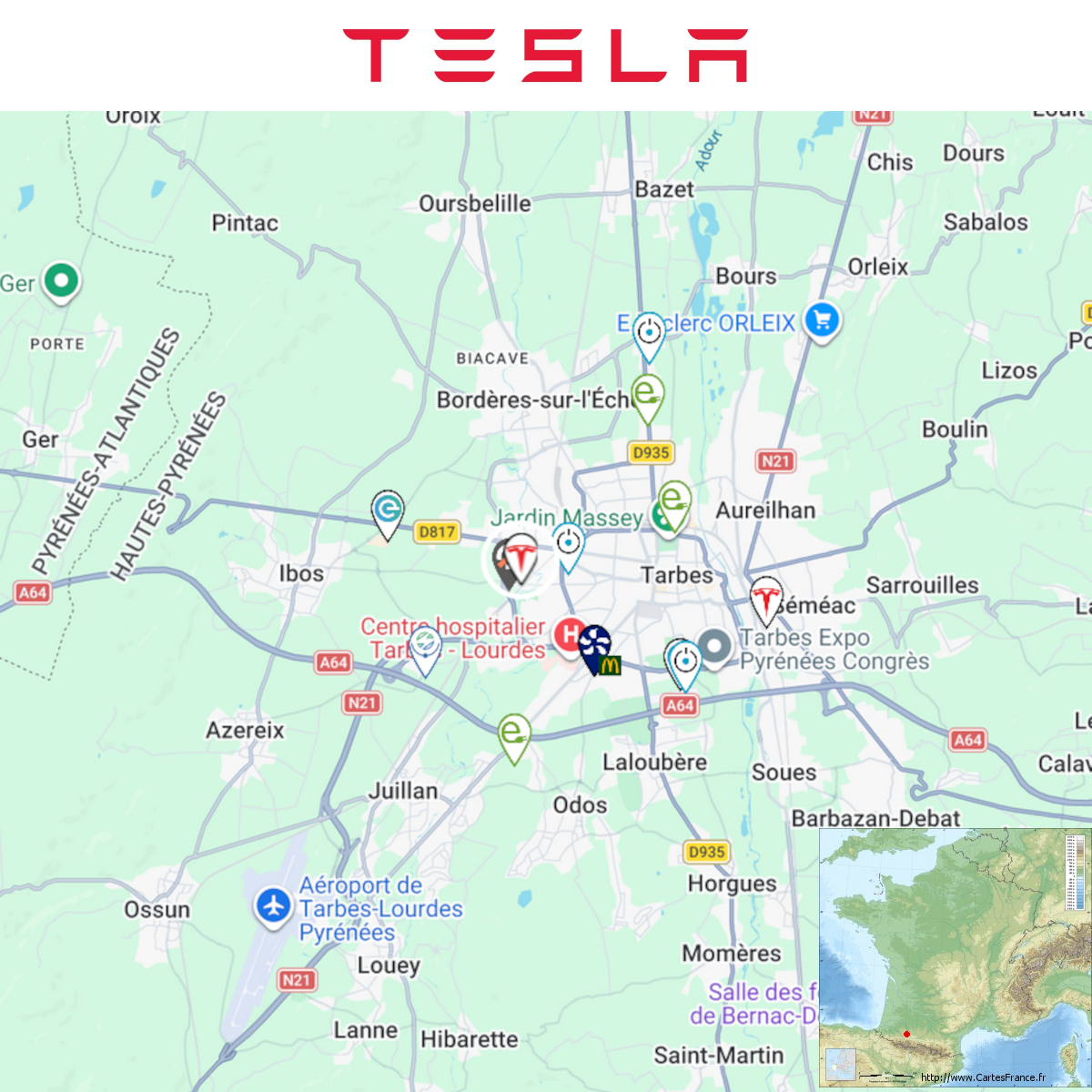 Ouverture d'une station Tesla à Tarbes (Grand Frais). 7x 250kW CCS Prix sans abonnement/non Tesla sur la capture Comme d'habitude, retrouvez le lien vers ma carte : https://tinyurl.com/StationsVE Toute l'actu des stations de recharge sur le groupe FB : https://tinyurl.com/GroupeFacebookVE -