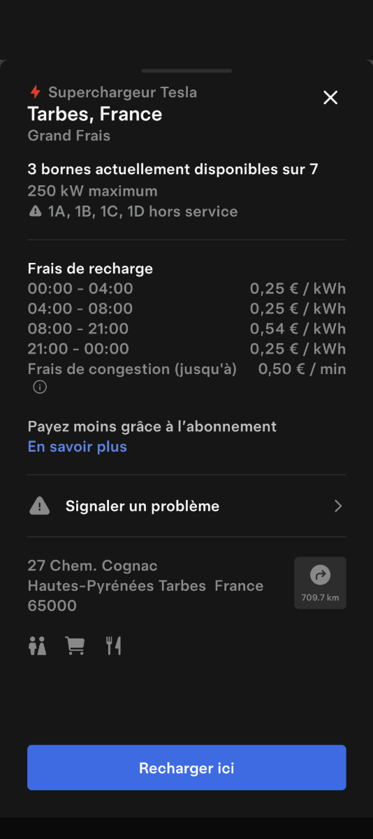 Ouverture d'une station Tesla à Tarbes (Grand Frais). 7x 250kW CCS Prix sans abonnement/non Tesla sur la capture Comme d'habitude, retrouvez le lien vers ma carte : https://tinyurl.com/StationsVE Toute l'actu des stations de recharge sur le groupe FB : https://tinyurl.com/GroupeFacebookVE