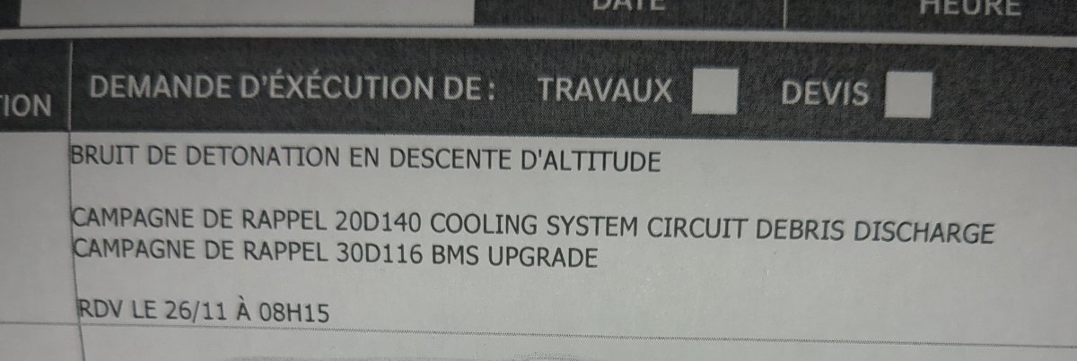 Réparation en court dans le calvados. Ils ont du me pendre pour un fou quand je leur ai expliqué le défaut. Apparemment il n‘y a pas de note technique officiellement diffusée en France. ou en tout cas c‘est ce que m‘a dit la dame du SaV. Ils comptaient immobiliser la voiture une journée entière, surtout qu‘ils n‘ ont jamais fait ce changement de pièce mais doivent finalement la garder jusqu‘à lundi car ils auraient reçu une patte de fixation cassée . -