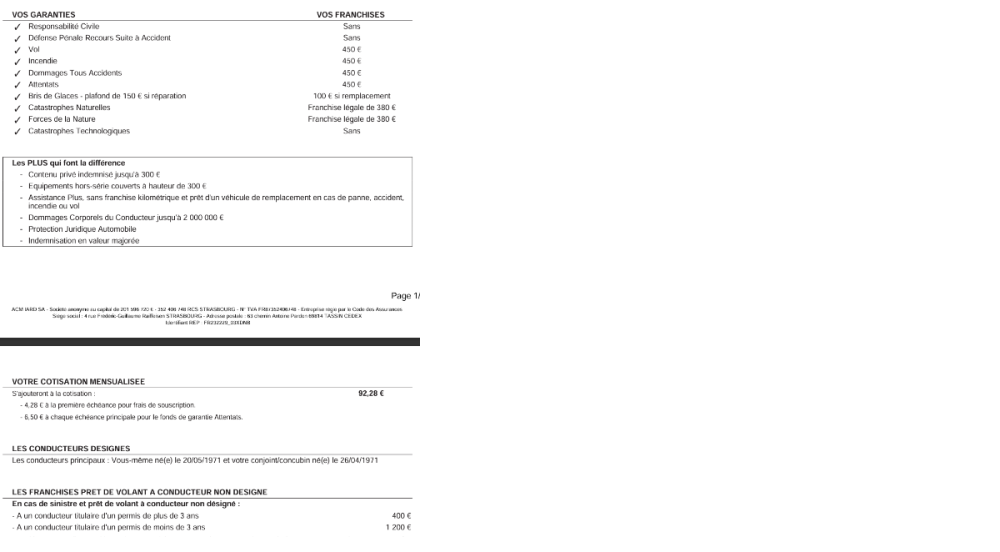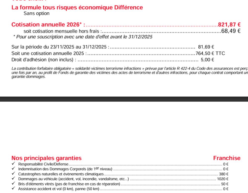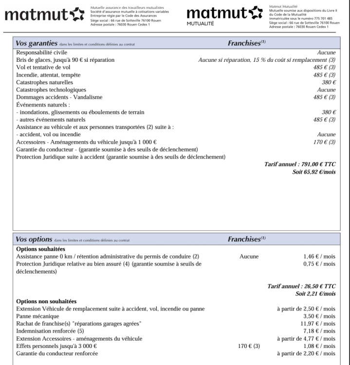 devis MAIF avec grosse franchise il faut ajouter 50 euros par an pour la protection conducteur qui est gere par le contrat PACS a prendre a cote avec une franchise 720 euros la prime est a 947 euros. Je vais prendre ca pour etre en dessous de 1000 euros en 2026 (+7.5% d'augmentation en 2026) ce qui est interessant avec la MAIF c'est la possibilite que ma fille la conduise avec une sur franchise de 220 euros ou bien la designation sur le contrat pour 120 euros par an. Ca c'est interessant car c'est pour tous les contrats. On va donc prendre la MAIF et mettre le vehicule de ma femme aussi. On paiera donc 120 euros une fois pour designer notre fille sur les deux contrats et 50 euros PACS une fois egalement. Tres complique le bonus. Chez MAIF si 4 ans a 50% sans dommage responsable = un joker. Si accident responsable: utilisation du joker et le bonus reste a 50%. au final MATMUT tres interessant si pas d'enfant -