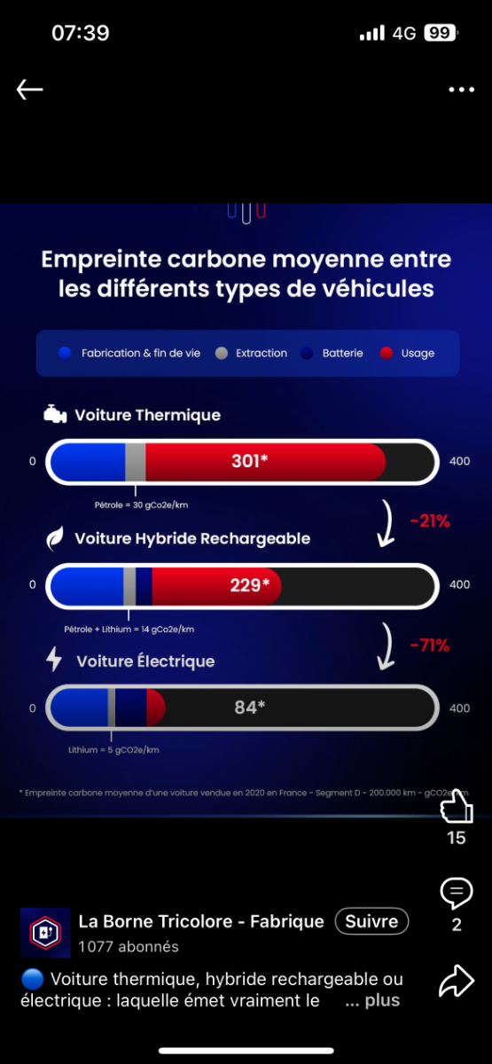 Ne laissons pas faire les vendeurs de pétrole. https://www.novethic.fr/economie-et-social/transformation-de-leconomie/lobbying-multinationales-americaines-demantelement-green-deal?utm_source=mailpoet&utm_medium=email&utm_source_platform=mailpoet&utm_campaign=taxation-des-ultra-riches-shell-poursuivi-stockage-de-co2-le-recap-du-12-decembre-789 Ce sont nos futures emplois qui sont en jeu. https://www.linkedin.com/posts/activity-7404920433147392001--Pni?utm_source=share&utm_medium=member_ios&rcm=ACoAABPob0YBtorDRELEOuHGbxqFzjbn5Je6fYI Certains nous affirment de fausses informations sur la supposée dette de la voiture électrique à sa fabrication. Mais là encore on a un exemple où les employés qui viennent travailler peuvent le faire en transport en communs. Peu où pas de parking on été prévu en conséquence. La part du co2 issue d’une usine l’est encore en partie non négligeable aux transports des salariés. De même on a pas de pétrole où de gaz mais on a bien du lithium où du nickel. https://www.linkedin.com/feed/update/urn:li:activity:7404920433147392001?commentUrn=urn%3Ali%3Acomment%3A(activity%3A7404920433147392001%2C7404956024740368384)&dashCommentUrn=urn%3Ali%3Afsd_comment%3A(7404956024740368384%2Curn%3Ali%3Aactivity%3A7404920433147392001) Alors regardons plutôt cette infographie ci-dessous même si je ne peux certifié ce résultat. l’objectif est bon. Très bon même et il devrait être valider pour acheter 100% d’électrique pour nos véhicules neuf. -
