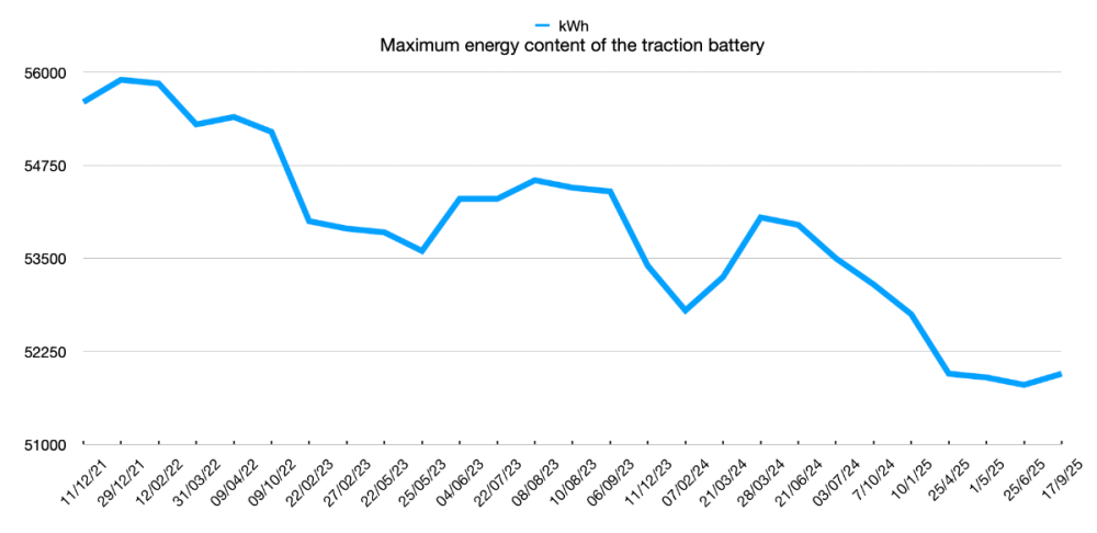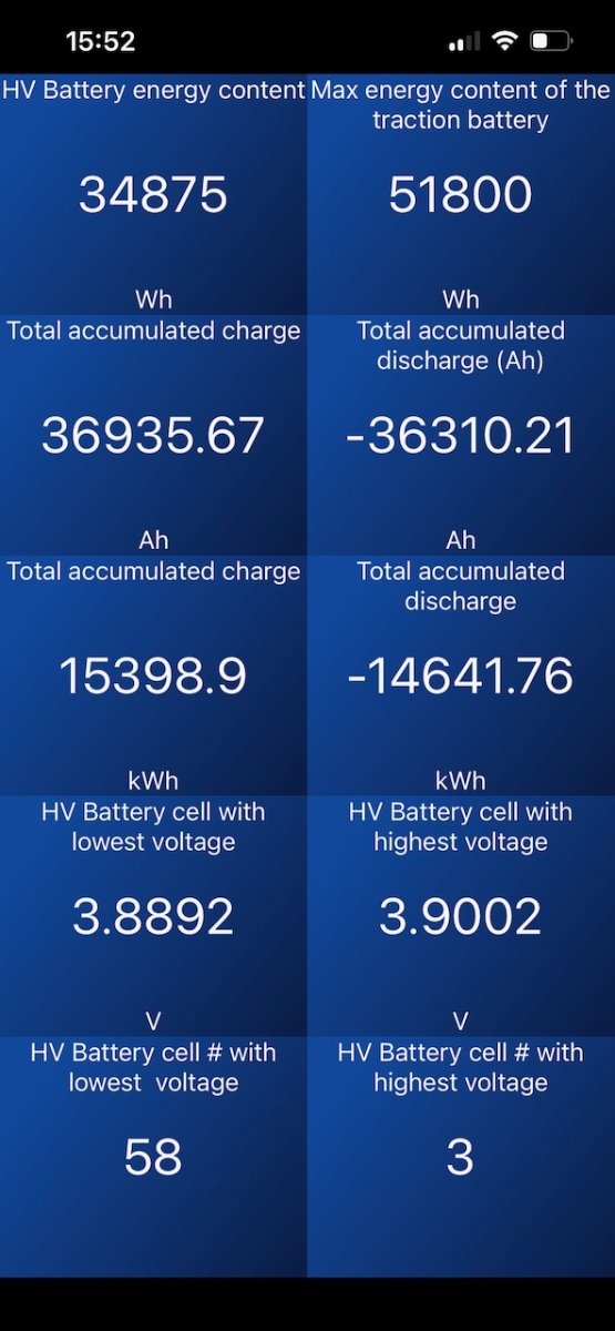Mise à jour après 4 ans et 62000 km de l'état de ma batterie, lu avec Car Scanner. Max energy content 52750 kWh, dégradation théorique 9% -