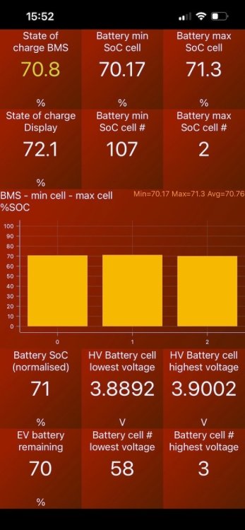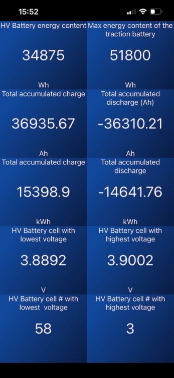 Mise à jour de mes stats: Batterie de 58kWh, 5 ans, 77500km. Maximum energy content of the traction battery: 51800kWh, soit 11% de dégradation. J'ai aussi remarqué une vitesse de recharge DC qui me semble plus lente à partir de 50%. Je vais poster les captures de l'état de la batterie dans l'autre post sur Car Scanner. Pas trop d'écart de tension des cellules pour l'instant. -