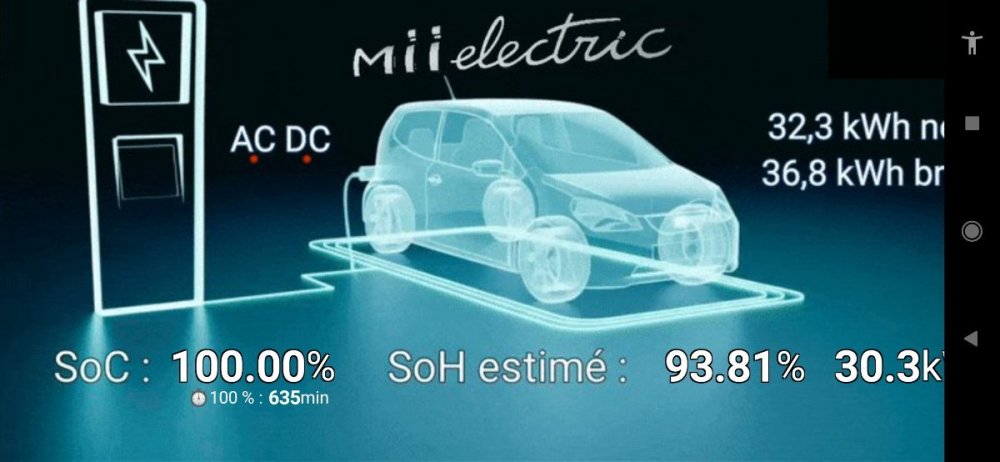 Màj de mon SoH (Seat Mii de juin 2021) : 15/08/2023, à 31,3 kWh (charge AC à 1,8 kW - CRO - température batterie au-dessus de 30°C) 14/02/2024 : 30,9 kWh (Charge AC 7 kW) 19/08/2024 : 30,4 kWh (Charge AC 7 kW - 27,3°C - 35 11/10/2024 : 30,6 kWh (Charge AC à 5A-1150W). 03/01/2025 : 31 kWh (Charge AC à 8A-1840W) 01/03/2025 : 30,0 kWh (Charge AC à 5A-1150W). 17/08/2025 : 29,7 kWh (Charge AC à 5A-1150W) => à noter, j'ai démarré la charge à un SoC assez élevé (environ 35%) sans vider la batterie, donc il n'y a pas eu recalibrage du BMS. Néanmoins, la valeur obtenue est cohérente avec les relevés depuis 2023 : 2% de perte depuis 2024, 2,8% de perte entre 2024 et 2023. 13/02/2026 : 30,3 kWh (93,81%) => La dégradation semble se stabiliser, c'est plutôt bon signe ! La voiture a 38167 km, usage urbain, et quelques trajets autoroutiers par an (environ 1000 à 1200km annuel). Recharge sur CRO, à 5A-1150W, à noter que la voiture est restée branchée environ 36 heures, l'équilibrage des cellules a eu largement le temps de se faire. -