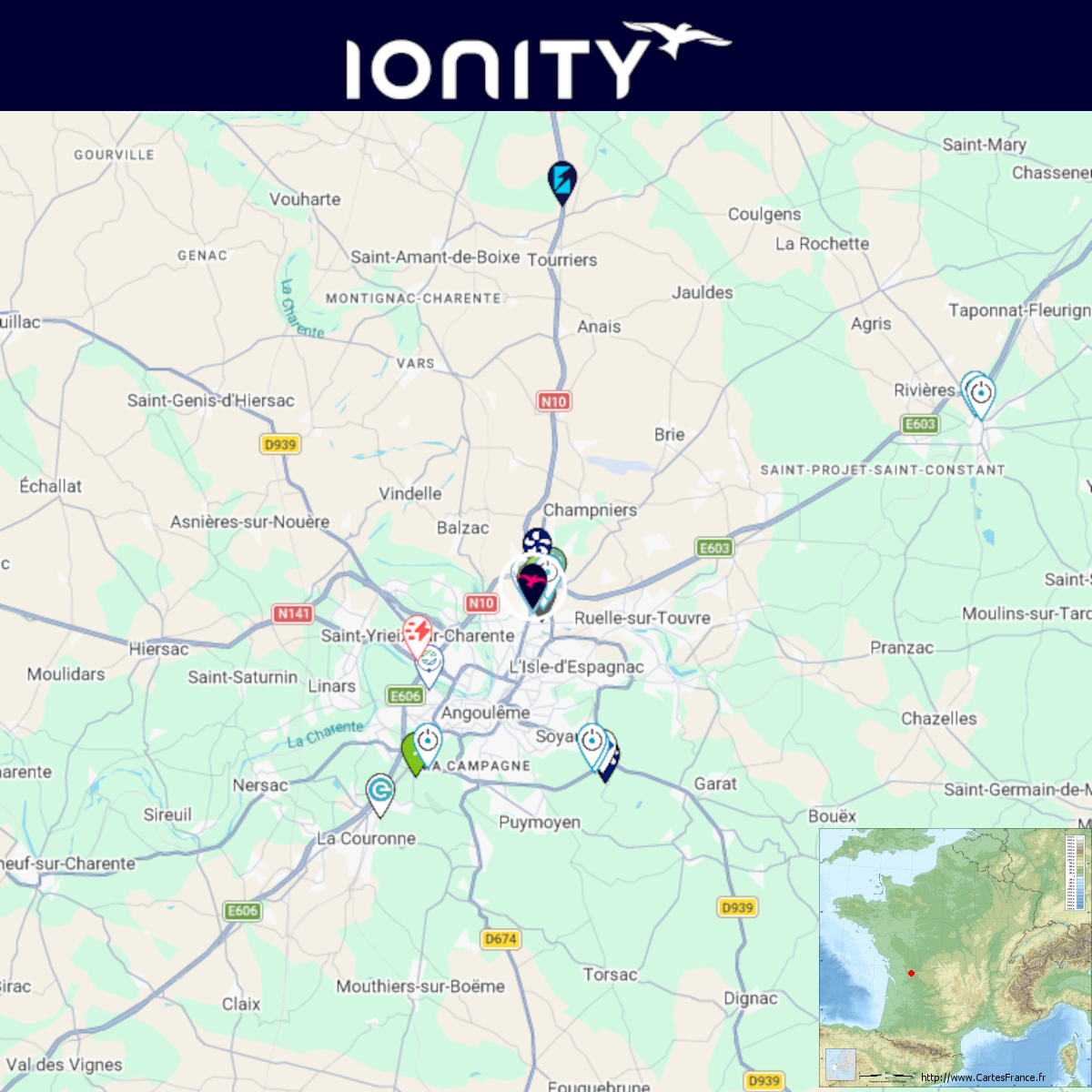 Ouverture d'une station Ionity à Champniers, au croisement des N10 et N41. 6x 250kW CCS Comme d'habitude, retrouvez le lien vers ma carte : https://tinyurl.com/StationsVE Toute l'actu des stations de recharge sur le groupe FB : https://tinyurl.com/GroupeFacebookVE -