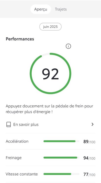 Hello, Je peux te mettre ce que j'avais pris en photo cet été (par canicule++ tu verras la température sur le tableau de bord...). C'était sur du Toulouse - bassin d'Arcachon. On s'arrêtait pour le goûter des enfants, dôc en fait c'est comme à chaque fois la voiture qui nous a attendu... J'ai a peu près roulé au maximum autorisé, sachant que sur la portion domicile - Toulouse - sortie de Toulouse je roulais certainement à 75 km /h de moyenne avec la circulation, perif etc.... Et aussi que la voiture est restée 10 minutes à l'arrêt avec la clim a fond avant le départ (la petite de 14 mois a l'époque, la mettre dans un véhicule dont l'habitacle était vraisemblablement à 50°C, je n'ai pas eu envie de tester...). Ce qui a donné 2h18 pour faire 235km. La recharge était à plus de 136kw, je ne suis pas resté devant la borne à contempler la courbe, mais elle était en progression lente vers un max que je ne saurais pas évaluer mais au tout petit peu au dessus. Pour ce qui est de l'hiver, je n'ai pas encore testé. Mais, comme toi dans le Sud-Ouest, je ne suis pas particulièrement inquiet.
