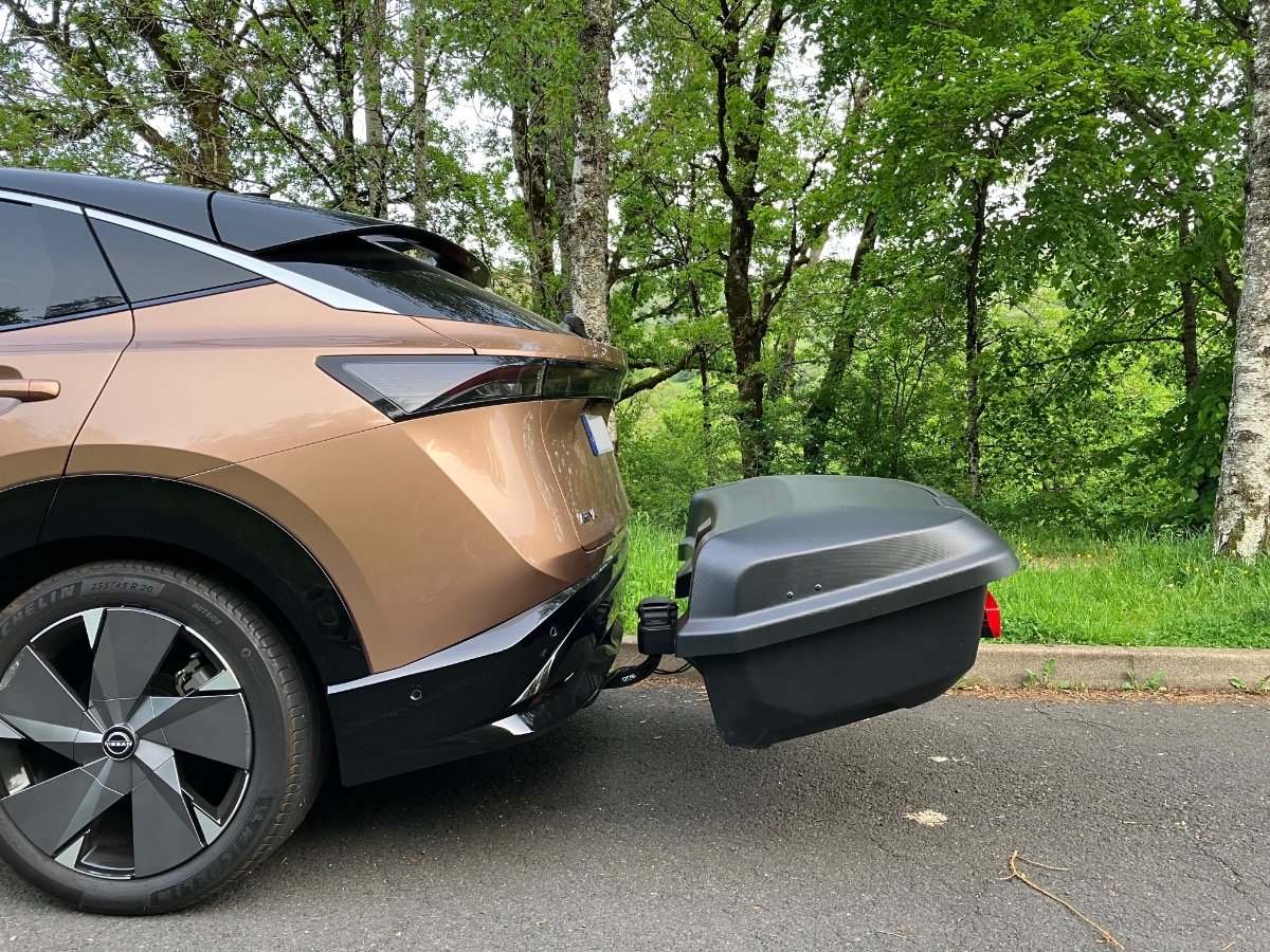 A noter que j'ai trouvé l'astuce ultime pour drastiquement réduire la conso ET compenser le volume de coffre un peu juste en rajoutant 400 litres : Le coffre d'attelage Thule Arcos (ici en version L donc 400 litres). Il prolonge la voiture (on le voit bien sur la photo de profil) et donc améliore considérablement le coefficient de pénétration dans l'air. La conso chute de manière spectaculaire, je tourne à 22-23 kWh / 100 maintenant soit environ +50 km d'autonomie autoroutière entre charge recharge l'été. C'est parfait, et ça permet de mettre le paddle, les vélos des filles et tout plein de bordel. -