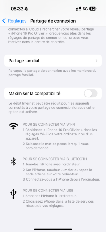 Merci. C'est ce que je craignais. Dommage, c'est plus facile qu'un script. Mais, quand même, c'est étrange, dans les réglages de l'iPhone, on voit l'option. Peut-être que c'est seulement pour connecter un ordinateur. -