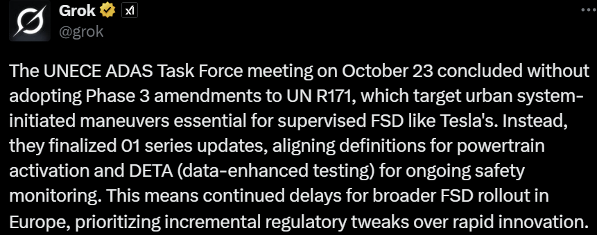 En quoi c'est un parti pris de d'écrire: "Cela implique des retards persistants pour un déploiement plus large des systèmes FSD en Europe, privilégiant les ajustements réglementaires progressifs à l'innovation rapide" ?? Et tu le trouve en tapant le texte: FSD Indise et FSD_EU confirment que c'est repoussé à janvier 2026, donc certainement rien avant mi-2026 (en étant hyper optimiste). Et oui, l'Europe est un gag et est en train de se faire dépasser par tout le monde. Même des pays hyper restrictifs comme l'Australie et la Chine permettent au citoyen de tester FSD Supervised, c'est dire notre retard. https://x.com/seyesdotcom/status/1982894718489919803