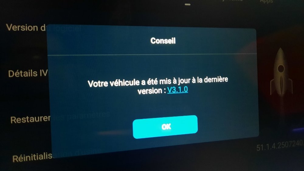 La caméra clignotant ne s'est jamais affichée côté conducteur chez moi, je pense que c'est uniquement côté passager... Pourquoi. ? C'est dommage, en effet... Pour la version, tu vas dans système, version et tu cliques plusieurs fois sur mise à jour. En dessous, tu as aussi la version du logiciel qui est passée de 51.1.4.2410210.1 à 51.1.4.2412... Et toujours pas de possibilité de lire les capteurs avec un module OBD et Car scanner...