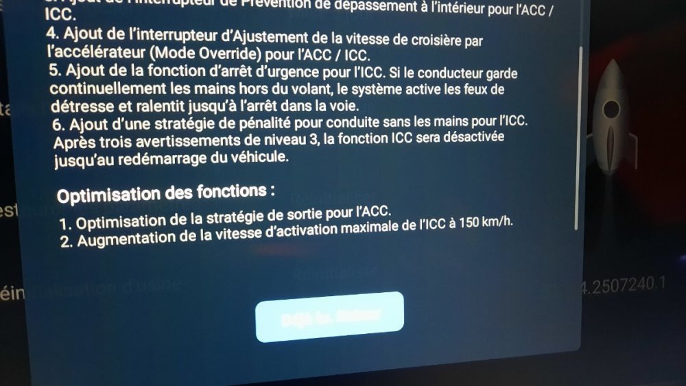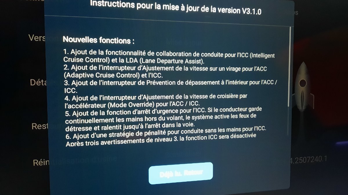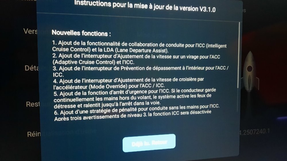 L' assistante BYD, qui annonçait Acc activé, acc désactivé, ICC activé...ICC désactivé..!! Après chaque démarrage, elle te redonnait l'état 1 fois qd tu les mettais et enlevais, en baissant la radio. 😬😬 Je n'ai pas le hud, je ne peux pas comparer 😎 Par contre, le line assist n'a pas été amélioré, il lui arrive de louvoyer et il se coupe san prévenir aussi, pas top pour la sécurité. J'ai eu 3 fois l'avertisseur sonore qui s'est mis en route, sans raison et sans rien annoncer sur le tableau de bord. Et il ne s'arrête pas..!!?!? Heureusement soir des trajets dans le village.