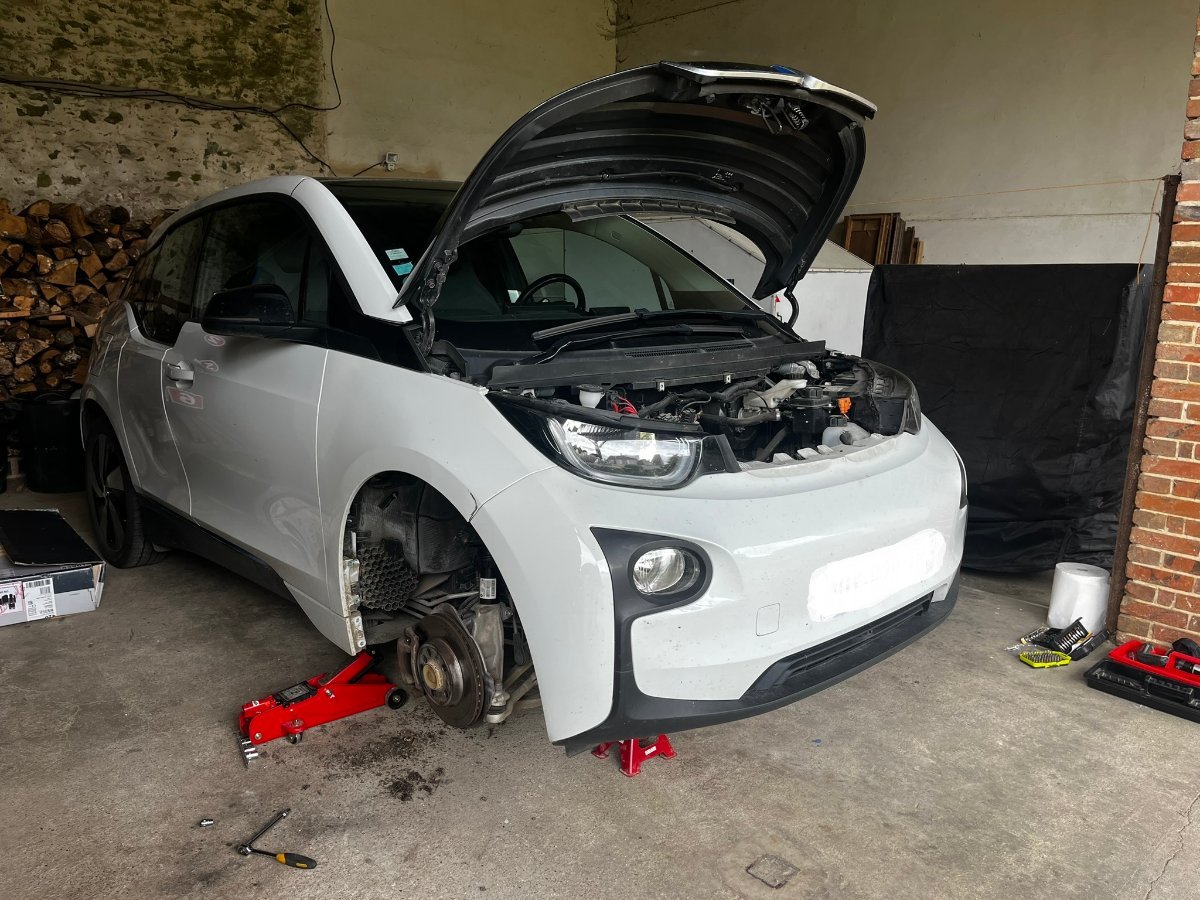 Ca y'est j'ai enfin pu trouver du temps pour faire ce fameux changement d'aile, vu que j'étais parti pour faire les amortisseurs et les freins, autant en profiter ! En résumé, cela se fait de la façon suivante : - placer la i3 sur chandelles (monter les deux côtés en parallèle afin de ne pas contraindre les batteries, prévoir les fameux tampons à placer sous les points de levage de façon à ne pas endommager les supports plastiques par les crics hydrauliques) - retirer la roue - retirer les arches de roues intérieures (en deux parties), nombreuses vis à retirer... prévoir une boîte pour tout stocker et ne rien oublier au remontage - retirer le cache supérieur entre les montants du pare-brise et l'aile (la partie noire, attention, prendre un outil plat de faible épaisseur et de bonne largeur, le genre de ceux utilisés pour démonter les garnitures intérieures, et repousser délicatement les taquets afin de pouvoir séparer la partie noire de l'aile). - dévisser la dernière vis qui est sous ce cache noir Remonter en sens inverse. NB : - il n'est pas nécessaire de retirer le pare-chocs avant (bouclier), ni les optiques contrairement à ce qu'indique ISTA. - soin et patience sont de rigueur... Bon courage ! -
