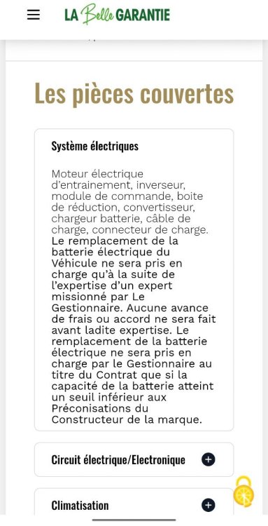 Ci-dessous leur réponse à mes questions par email : Nous vous remercions pour votre demande et pour l’intérêt que vous portez à nos solutions d’extension de garantie pour véhicules électriques. Veuillez trouver ci-dessous les éléments détaillés relatifs à la couverture proposée pour votre Peugeot e-208 électrique, mise en circulation en avril 2022, affichant environ 49 500 km à ce jour. 1. Batterie de traction Période de couverture La batterie de traction est couverte par notre contrat dès la mise en place de la garantie, y compris pendant la période de garantie constructeur Peugeot. L’intervention de notre garantie s’effectuera en complément, après application prioritaire de la garantie constructeur lorsqu’elle est encore en vigueur. Nature de la prise en charge La batterie est prise en charge : en cas de panne avérée, ou si son autonomie ne respecte plus les préconisations du constructeur pour un fonctionnement normal, après expertise. Plafond spécifique batterie Aucun plafond spécifique n’est appliqué à la batterie de traction. 2. Composants électriques et électroniques couverts Les éléments suivants sont couverts par le contrat : Moteur électrique Inverseur / convertisseur Chargeur embarqué et connecteur de charge Électronique de puissance et calculateurs Climatisation (compresseur inclus) Direction assistée électrique Systèmes ABS / ESP Multimédia et écrans d’origine constructeur 3. Exclusions principales Les pièces d’usure ne sont pas couvertes par le contrat. En revanche, toute pièce défaillante figurant au contrat est prise en charge, dès lors que la panne est caractérisée et conforme aux conditions générales. 4. Franchise, plafonds et frais Franchise : aucune Plafond de remboursement par sinistre : aucun Frais de diagnostic : pris en charge jusqu’à 150 € par panne couverte Avance de frais : aucune – le règlement est effectué directement auprès du garage réparateur 5. Conditions d’entretien L’entretien peut être réalisé dans le garage de votre choix, sans obligation de réseau constructeur. En cas de sinistre, les justificatifs suivants pourront être demandés : devis détaillé (pièces et main-d’œuvre), relevé de diagnostic si nécessaire, photos ou vidéos selon la nature de la panne. Suite à votre demande, vous trouverez ci-dessous le détail de la garantie E PREMIUM, notre couverture la plus complète, parfaitement adaptée à votre Peugeot e-208. Cette garantie vous permet de rouler en toute sérénité, en couvrant l’ensemble des organes essentiels de votre véhicule, tant mécaniques qu’électriques, pour une durée au choix de 12 à 24 mois, à raison de : ➡️ 25€/mois par prélèvement mensuel ✅ Les principaux avantages de la formule PREMIUM : Prise en charge pièces & main-d'œuvre Zéro avance de frais en cas de panne Aucune franchise, aucune vétusté Garantie cessible en cas de revente Validité dans tous les garages de France et de l’Union Européenne ⚙️ Éléments couverts – Véhicules électriques : Moteur électrique Batterie de traction Inverseur Module de commande Boîte de réduction Convertisseur Chargeur de batterie Câble de charge Connecteur de charge 📄 Pour finaliser votre souscription, merci de bien vouloir nous transmettre : Le mandat signé avec la durée choisie Une copie de votre RIB Une copie de votre pièce d’identité Une copie de la carte grise