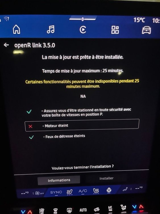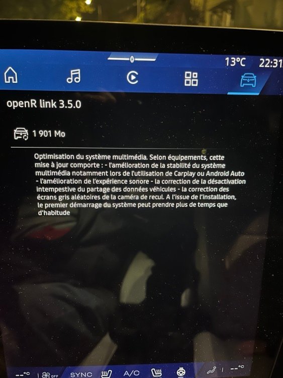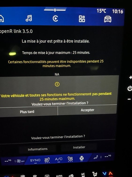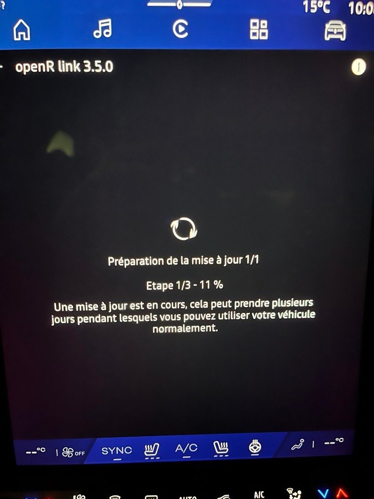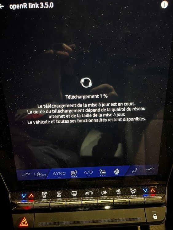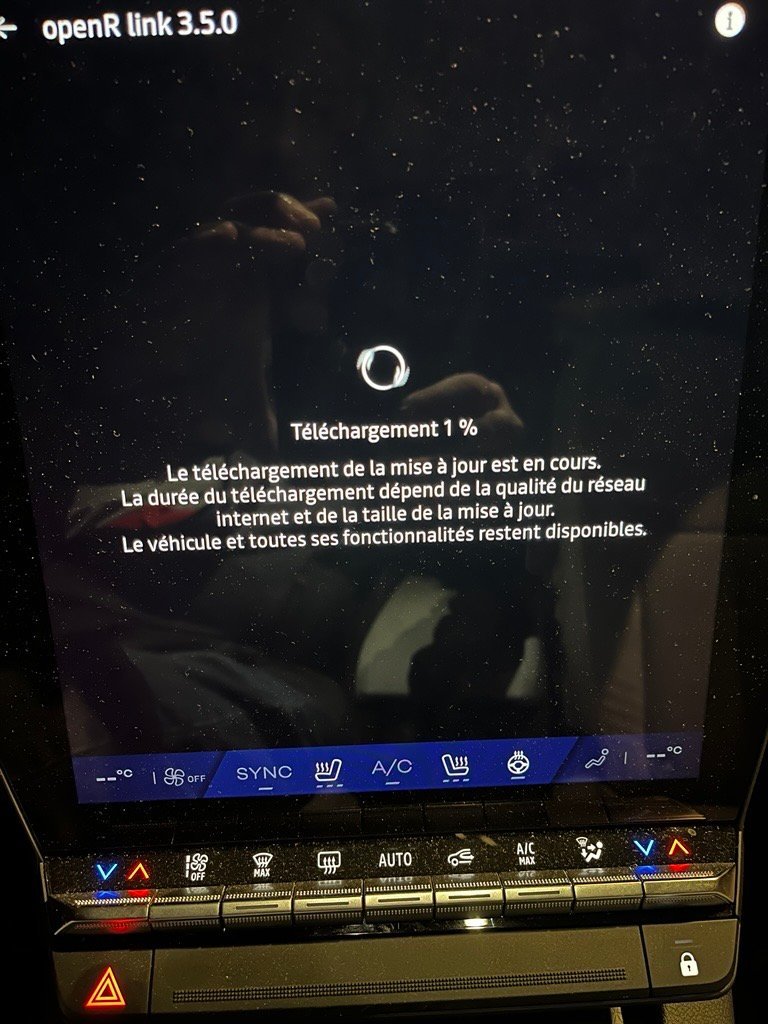 Bonjour, J'ai eu le temps de prendre quelques photos sur la mise à jour OpenRLink 3.5.0 pour ceux qui n'ont jamais eu de FOTA Après avoir lancer la recherche de mise à jour dans les réglages Systeme de la voiture Lancer le téléchargement (si on clique sur Info, on le descriptif, j'ai déjà râlé sur la mise en page ) Lancer le téléchargement (dans mon cas 35mn) La préparation de la mise à jour se lance Une fois prête, la mise à jour dure 25mn, moteur éteint, cliquer sur Installer Puis cliquer sur Accepter Et zou c'est fait