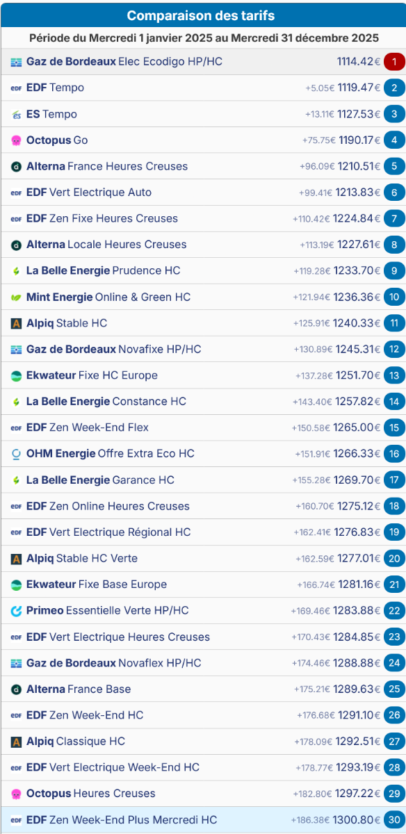 Capfile permet d'avoir une comparaison selon sa consommation réelle passée. Dans mon cas, Go reste bien placé mais je suis l'offre Gdb via Ecodigo (1) qui n'est plus commercialisée. A noter que Ecodigo relance un achat groupé gaz et électricité.