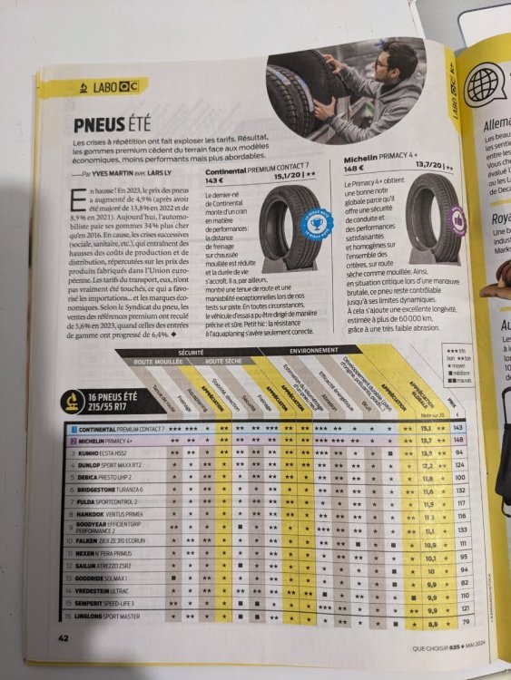 Ci joint les comparatifs 2023 et 2024. J'ai des e primacy sur une e46 atmo qui sert uniquement le weekend, clairement dès que la route est humide malgré le peu de couple et l'arrivée progressive ça glisse. Sur ma mg4 j'ai mis des conti7 premium et la tenue de route sur mouillée est juste phénoménale. Les tests tcs en Suisse concordent généralement. Bon choix.- 23 réponses