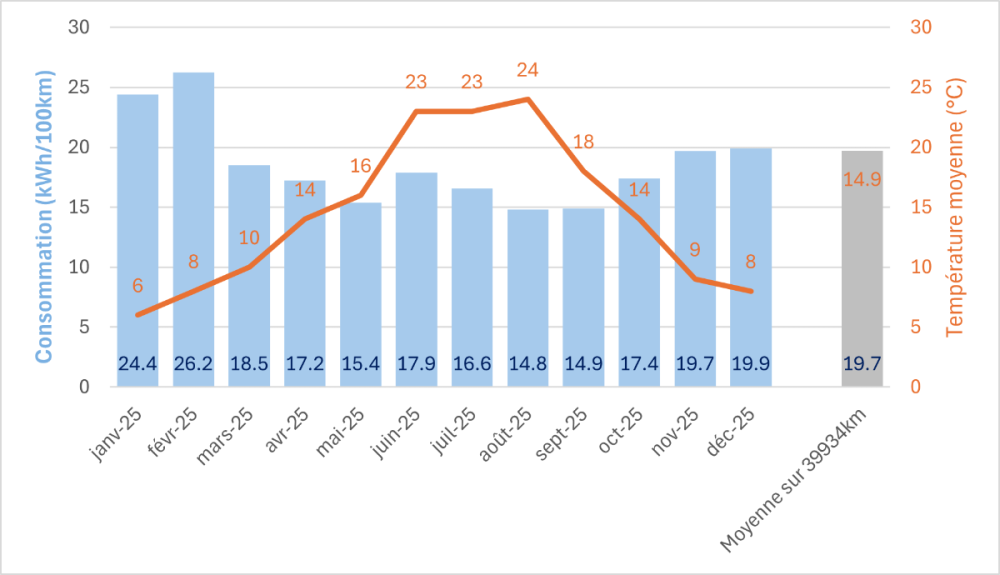 Bonjour, J'ouvre ce sujet pour fournir quelques informations sur la consommation réelle de la MG4, pas celle affichée par la voiture. J'ai une MG4 Standard livrée début Mars 2024. Je charge uniquement avec le chargeur MG sur une prise renforcée, sans rallonge, la très grande majorité du temps en 10A. Dans le tableau électrique j'ai monté un compteur dédié a cette prise uniquement, et celle-ci n'est utilisée que pour la recharge de la voiture. Je n'ai pas pensé à faire un suivi mensuel dès le début (j'ai commencé à le faire depuis le mois de décembre 2024), pour voir l'influence de la température extérieure sur la consommation, mais maintenant que je le fais, je vais actualiser le graphique au fur et à mesure. La voiture dors dehors et fait presque exclusivement de la ville et du péri-urbain avec très peu d'autoroute (environ 1000km sur les 18000 qu'elle a déjà parcourue).