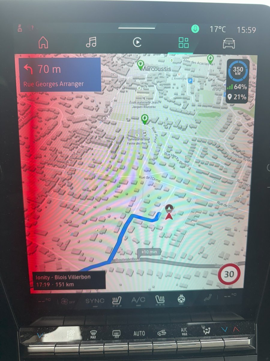 Non, il n'y a pas de planificateur. Je pense que seules les versions 'full Android' en sont équipées donc les versions 'Techno' et 'Iconic'. Pour ces versions, j'avais regardé ce que je perdais à prendre la version 'Evolution' la moins chère : - Pas de barres de toit : Mais je trouve aussi qu'elle est plus chouette sans et je ne me sert plus de barres de toit depuis longtemps. - Pas de full android... Mais j'utilise Waze et ABRP depuis mon téléphone Android en version sans fil et ça fonctionne étonnamment bien. D'ailleurs, j'ai découvert qu'avec la dernière version d'Android (16 je crois sur mon Pixel) et Android Auto, on a non seulement l'écran de Waze avec la carte sur l'écran de droite, mais en plus, lors de la navigation, on a un rappel des consignes sur l'écran derrière le volant, par exemple une flèche qui tourne à droite et l'indication 350 m). Je croyais que cette fonction était réservée aux versions plus haut de gamme... - Je n'ai pas l'assistant 'Reno'... Mais lors fe mon essai en concession, j'avais une 'Iconic', et le premier truc que j'avais fait était de supprimer ce gadget pénible et intrusif. - J'ai une antenne 'fouet' super longue sur le toit qui passe limite dans mon garage. J'aurais préféré l'antenne requin, mais quand j'aurais compris les variantes de câblage (FM/DAB/GSM/GPS/12volts/Masse) qui sont réellement dispo, j'achèterai une antenne requin et je la changerai peut-être plus tard. - Les jantes 'Evolution' me paraissaient bizarres au début, mais finalement c'est assez cohérent et moderne. - La couleur de base gratuite est ce 'Rouge Bordeau' un peu foncé tirant sur le 'cahors cepage malbec', c'est exactement ce que je voulais, je la trouve très élégante comme ça. - J'ai pris sur AliExpress une prise V2L à 29€ (option à plus de 250€ chez Renault), et je vais la tester, je vous ferai un retour. De toute façon, c'est une option pour les versions 'Techo' et 'Iconic' aussi. - J'ai acheté des super tapis de sol 70€, mais ils ne sont pas 'Renault'. - Il n'y a pas de Tweeter, mais le son est 'correct'. Donc 4 HP au lieu de 6 HP dans les versions 'Techno' et 'Iconic'. Je vais vérifier si c'est pré câblé pour ajouter des tweeter plus tard.. D'où mon choix de partir sur la version 'Evolution' 150cv 52kWh...