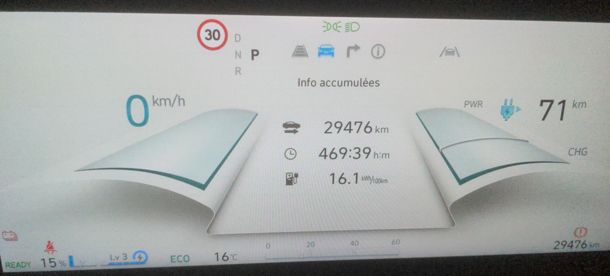 Alors en ce moment à 80 % je suis à 405 km d'autonomie donc 507 à 100 % soit autonomie de 77,4 kwh / 507 = 15,18 kwh en roulant pas mal à 110 en bretagne normal. en mode éco pour la plupart du temps mais je fais aussi qq mode sport
