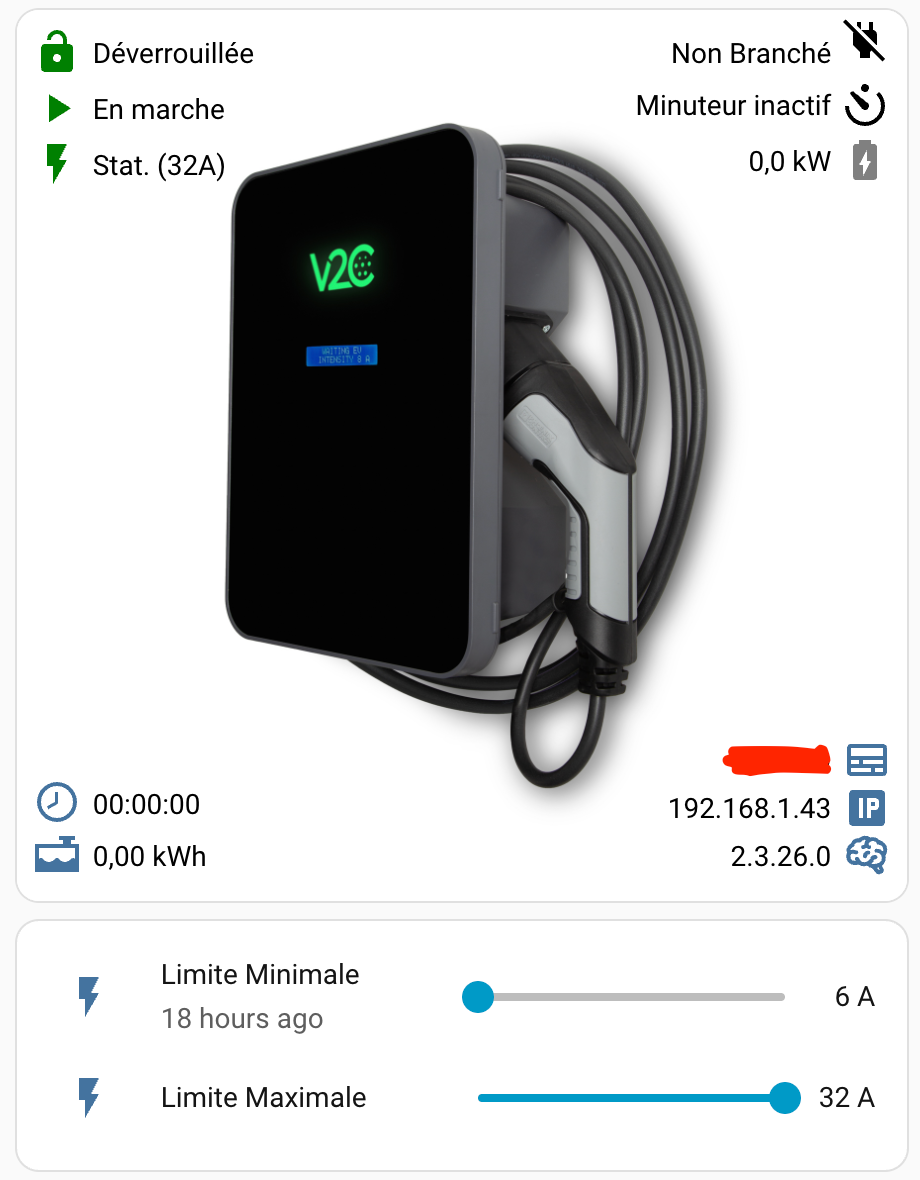 Je me suis fait un petit dashboard qui me permet de la piloter depuis Home Assistant sans avoir à aller ni sur l'app V2C du cloud, ni ouvrir l'application de la marque sur mon smartphone. Tout dans HA, comme l'ensemble de ma domotique. Intégration totale.