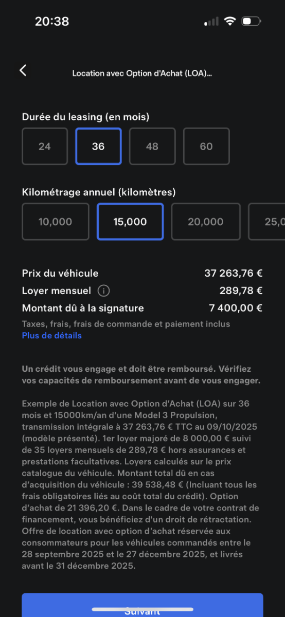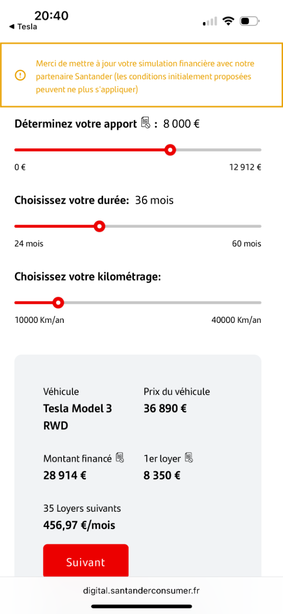 Je choisis la LOA. Sauf que quand on passe de l'appli Tesla vers la page "Santander", les chiffres sont totalement farfelus. Après contact vendredi avec une conseillère de Maurepas, il semblerait qu'il y ait un bug chez Santander. Elle m'a demandé d'attendre de ses nouvelles semaine prochaine. Avez vous déjà rencontré ce problème? Quand vous passez de l'appli Tesla qui vous donne un chiffrage, vous retrouvez bien les mêmes informations? Merci de vos éclaircissements et de votre expérience. Je vous joins les deux écrans, le noir donne les chiffres corrects et vous verrez que sur le blanc (Santander), tout est farfelu! Merci de votre aide et de vos conseils. L'expérience Tesla commence mal!