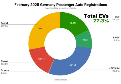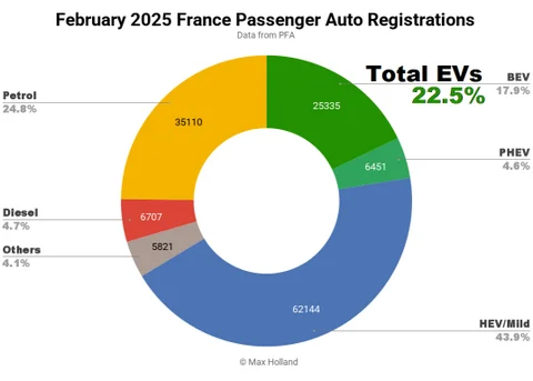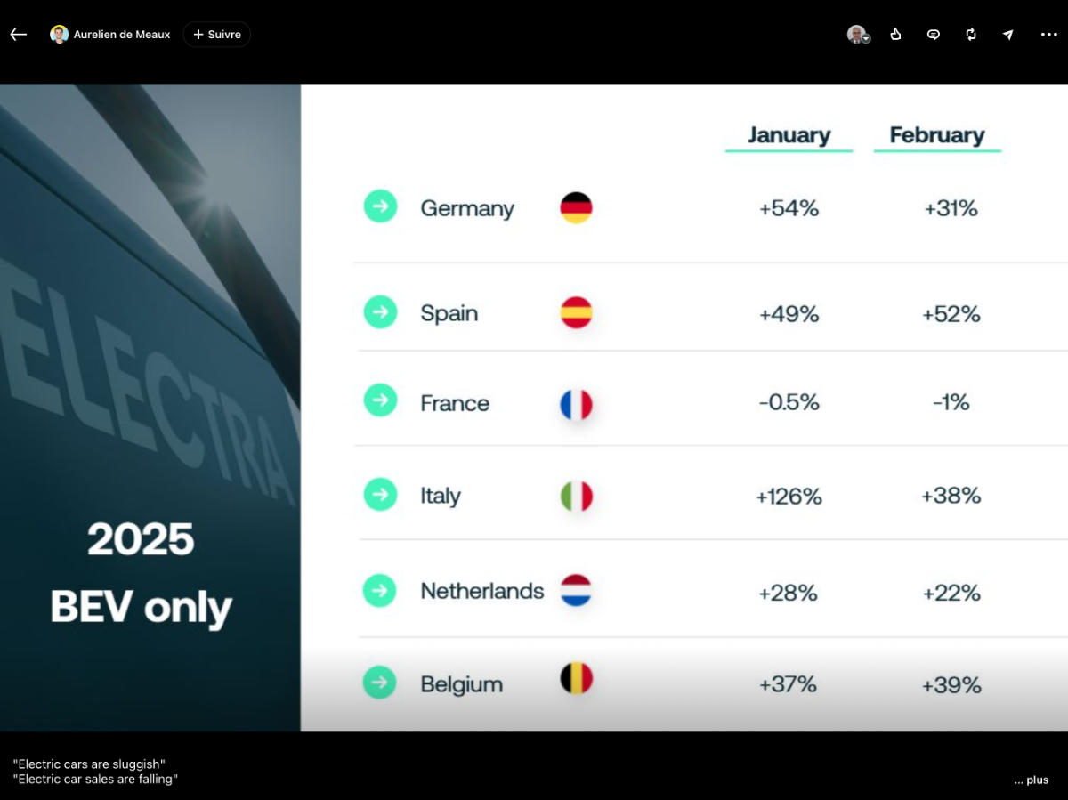 bah l'idée c'est de parler des voitures électriques, non?... Donc l'Allemagne a tout juste rejoint la France. L'Italie et l'Espagne en sont encore très loin, donc dire que "les ventes s'envolent partout" sauf chez nous n'a pas beaucoup de sens.