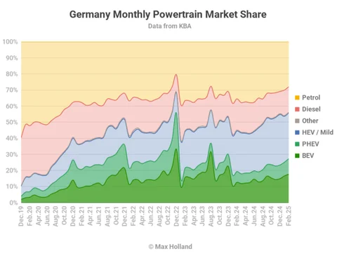 Pour l’Allemagne la croissance ne date pas uniquement du mois de février +31 le mois de janvier était également en hausse mais cela fait 12 mois que la hausse en Allemagne est continue. Cette après une gamelle mais en hausse continue pour arriver à 27,2% de part de marché qui ne semble pas s’arrêter. Non la part de marché en France 22,5% est plus faible qu’en Allemagne mais tout dépend ce que l’on met dedans.