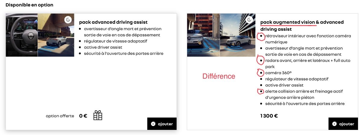 EDIT : En fait les radars arrières latéraux sont présents dès l'option Advanced driving assist. Donc le park auto doit se baser sur les caméras (probablement en complément des radars).