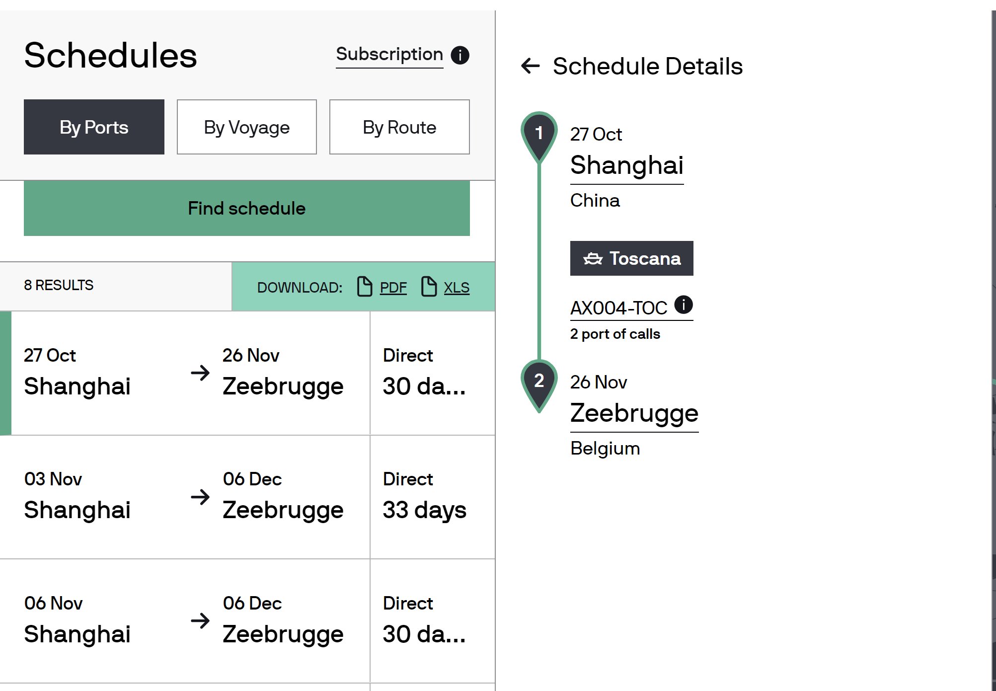 Un autre bateau pourrait suivre, le Tannhauser (https://www.walleniuswilhelmsen.com/schedules), départ le 6 novembre, arrivée le 6 décembre (facile à calculer comme ça). Les autres ne sont pas directs donc je pense que ça sera le dernier de l'année depuis la Chine.